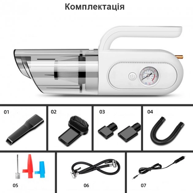 Дана модель пилососу з компресором дає змогу накачати колеса до 8 Атм, а завдяки трьом змінним насадкам, стане у нагоді на відпочинку за містом, або у побутових справах. Для визначення тиску, на корпусі розташований аналоговий манометр.
