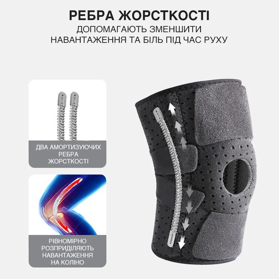 Бандаж на коліно оснащений ребрами жорсткості, що надійно стабілізують колінний суглоб та забезпечують рівномірний розподіл навантаження.