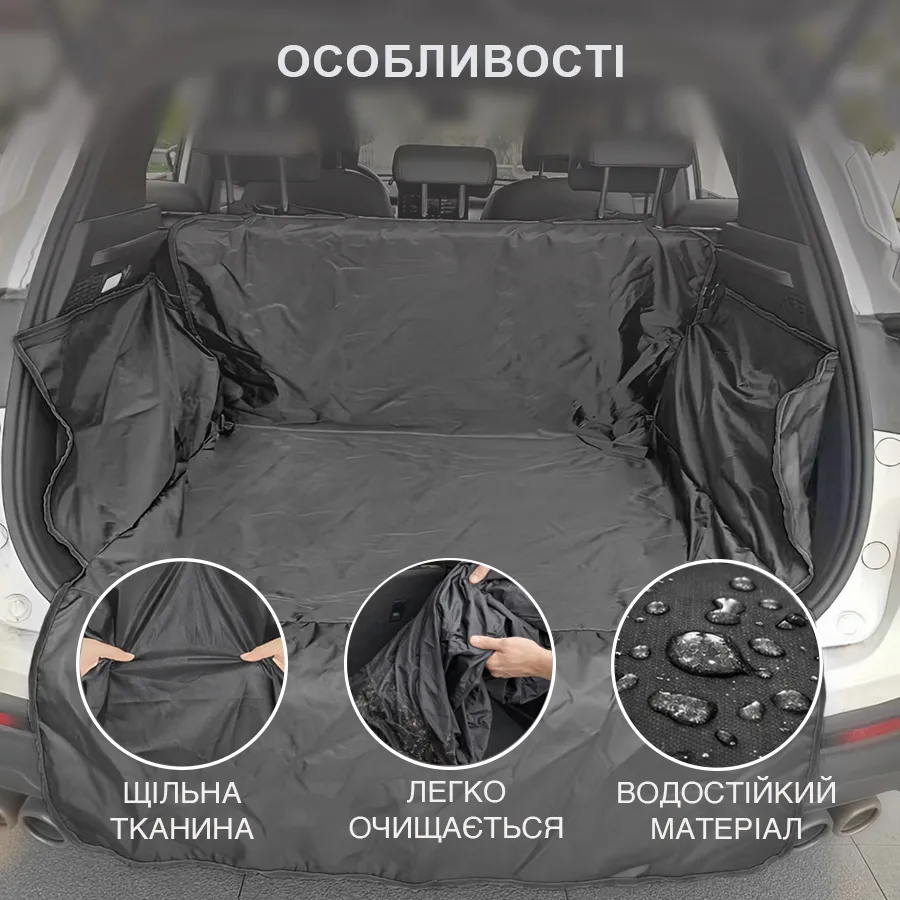 Чохол в багажник для собак виготовлений із щільного вологостійкого матеріалу, який не пропускає вологу та бруд. Тканина добре тримає форму та не розтягується.
