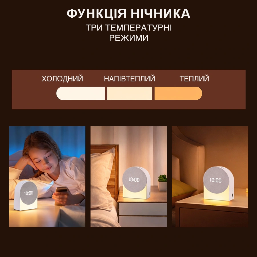 Генератор білого шуму має функцію нічника з трьома температурними режимами освітлення: теплий, напівтеплий та холодний. Це створює комфортну атмосферу в кімнаті.