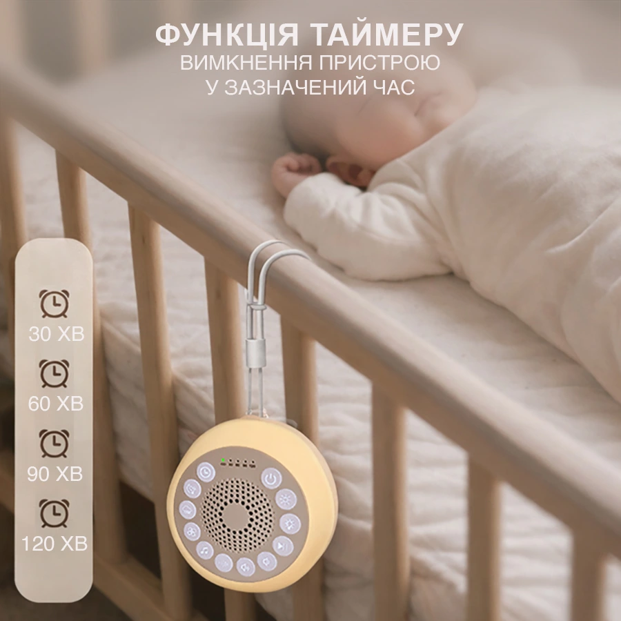 Генератор білого шуму з нічником оснащений таймером на 30, 60, 90 або 120 хвилин. Це забезпечує автоматичне вимкнення пристрою за вказаним часом.