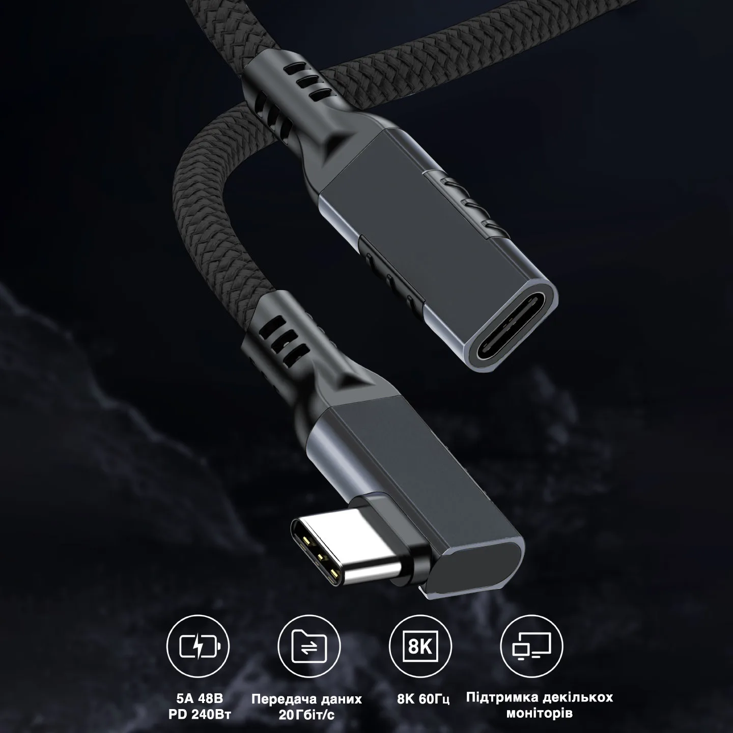 Кабель Type-C – Type-C 240Вт 1.2 м 80 Гб/с Thunderbolt 5/4/3 USB4 16К 60Гц з обплетенням кутовий