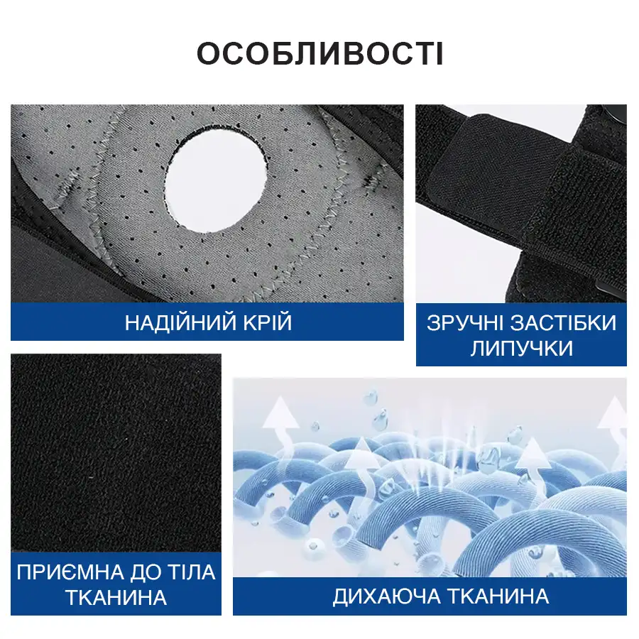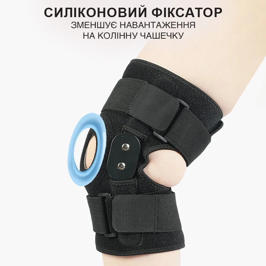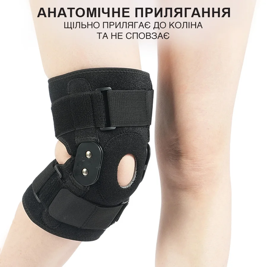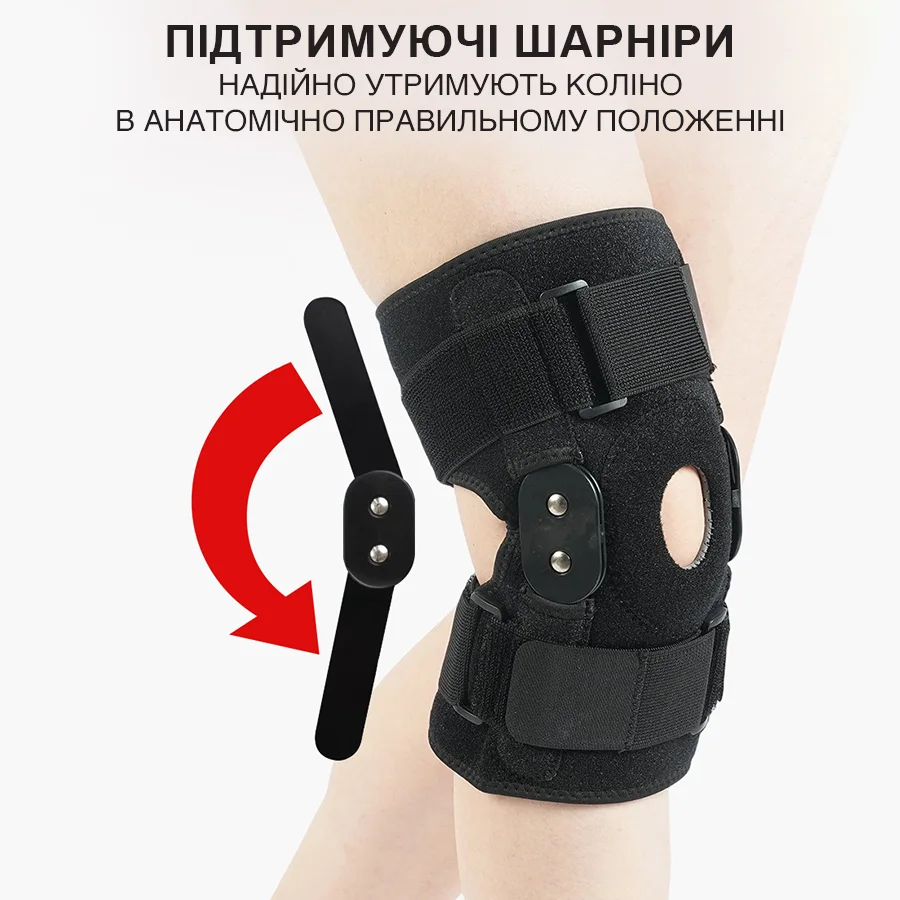 Ортез на коліно має підтримуючі шарніри, що забезпечують надійну фіксацію та активну підтримку колінного суглоба під час навантажень.