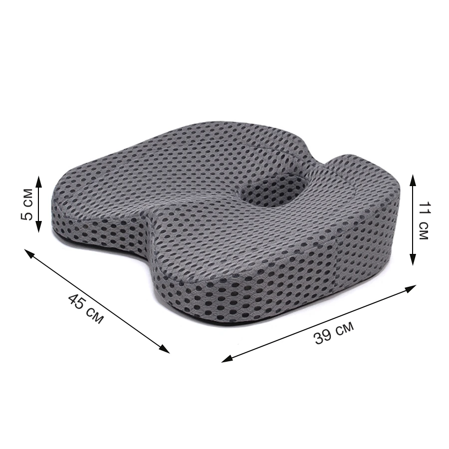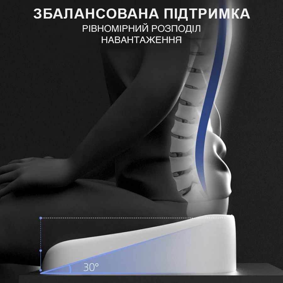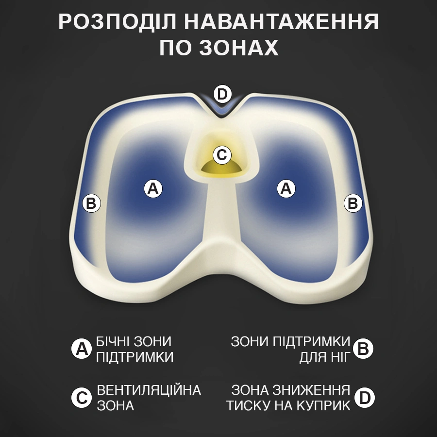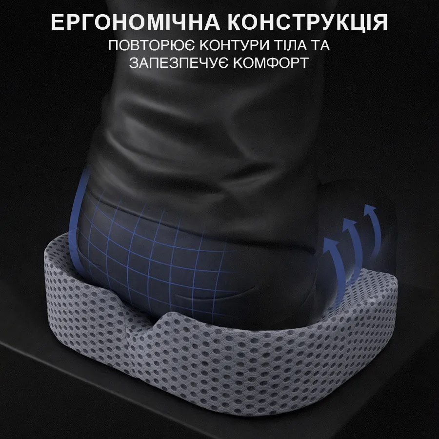Ортопедична подушка для сидіння виготовлена з піни Memory Foam, яка адаптується до контурів тіла. Це допомагає знизити навантаження і сприяє збереженню правильної постави під час сидіння.