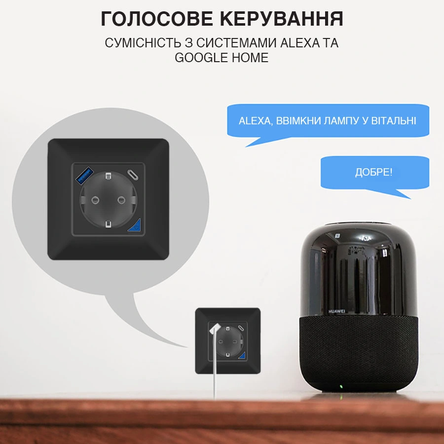 Розумна Wi-Fi розетка сумісна з Amazon Alexa та Google Home. Завдяки цьому користувач може керувати подачею живлення в розетці за допомогою голосових команд.