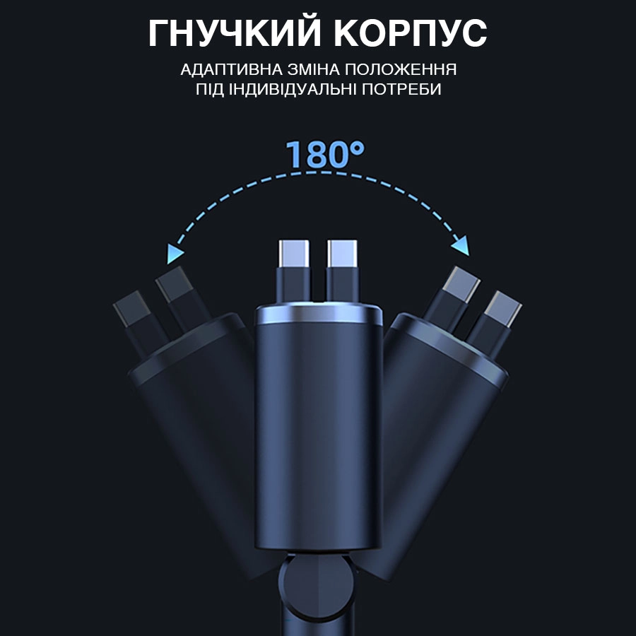 Гнучкий корпус зарядного пристрою в авто обертається на 180 градусів, що дозволяє легко налаштувати зручне положення під індивідуальні потреби.